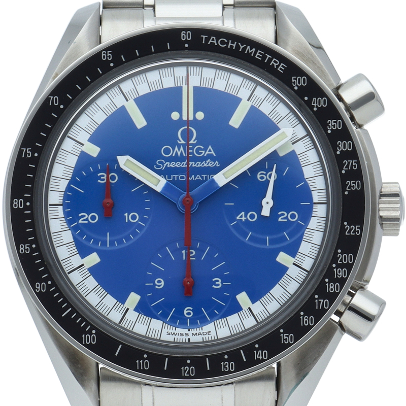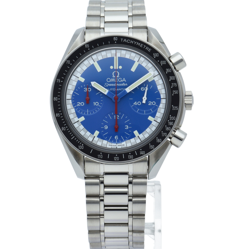 数々のF1チャンピオンに輝いたシューマッハとオメガのコラボレーション「スピードマスター」。シンプルな中にもひときわ目立つ文字盤の配色がオシャレな1本。