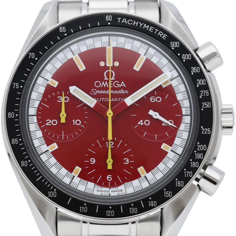 数々のF1チャンピオンに輝いたシューマッハとオメガのコラボレーション「スピードマスター」。シンプルな中にもひときわ目立つ文字盤の配色がオシャレな1本。