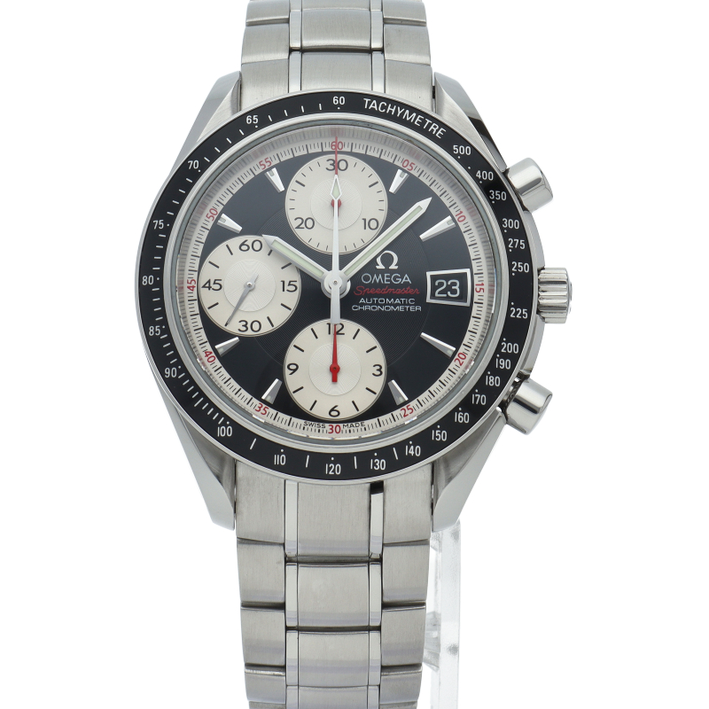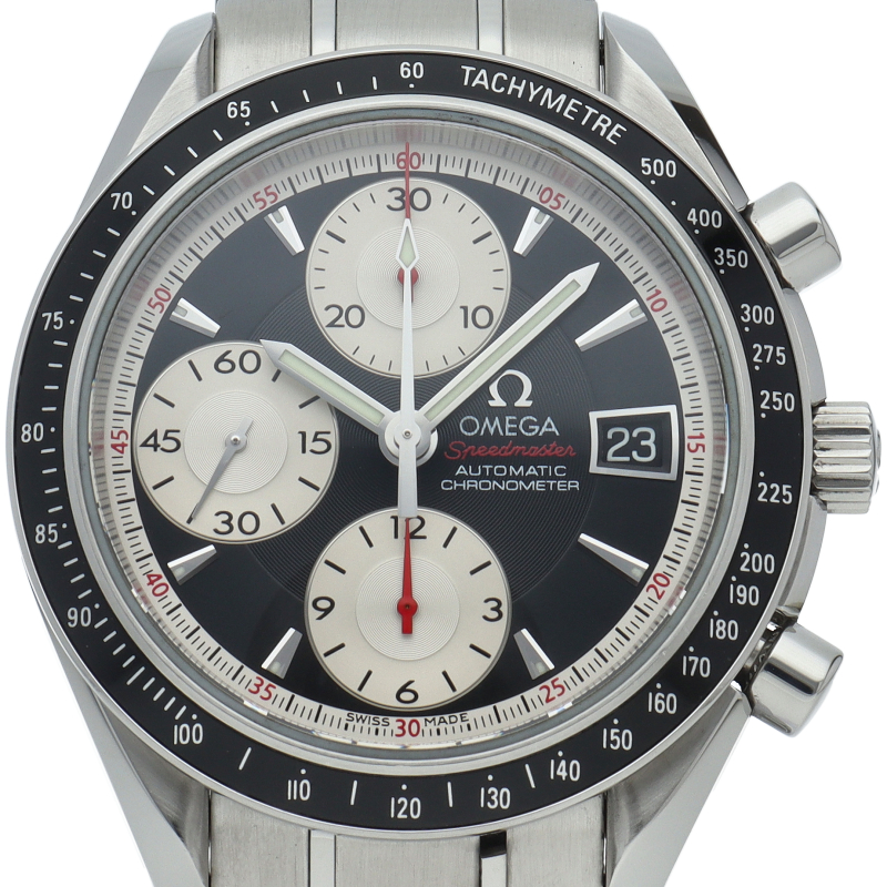 オメガの代表的な人気シリーズ「スピードマスター・デイト」。クロノグラフ・デイト表示機能付きと便利で実用性のある1本です。
