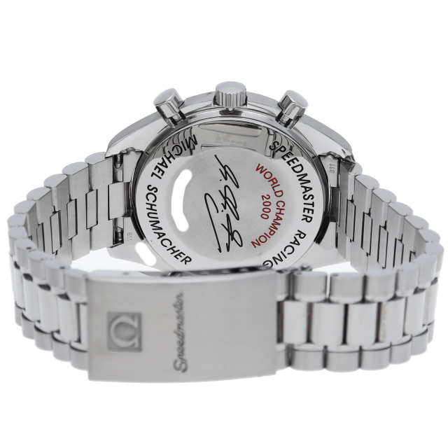 モータースポーツをイメージして設計された「スピードマスター レーシング」。ミハエル・シューマッハが2000年にF1ワールドチャンピオンになったのを記念したモデル。タキメーターの表示とシューマッハの刻印、オレンジとレッドカラーがよりレーシングモデルらしい雰囲気を演出しています。世界限定4000本。