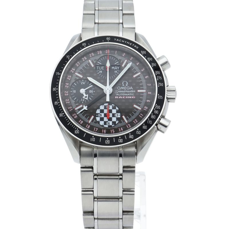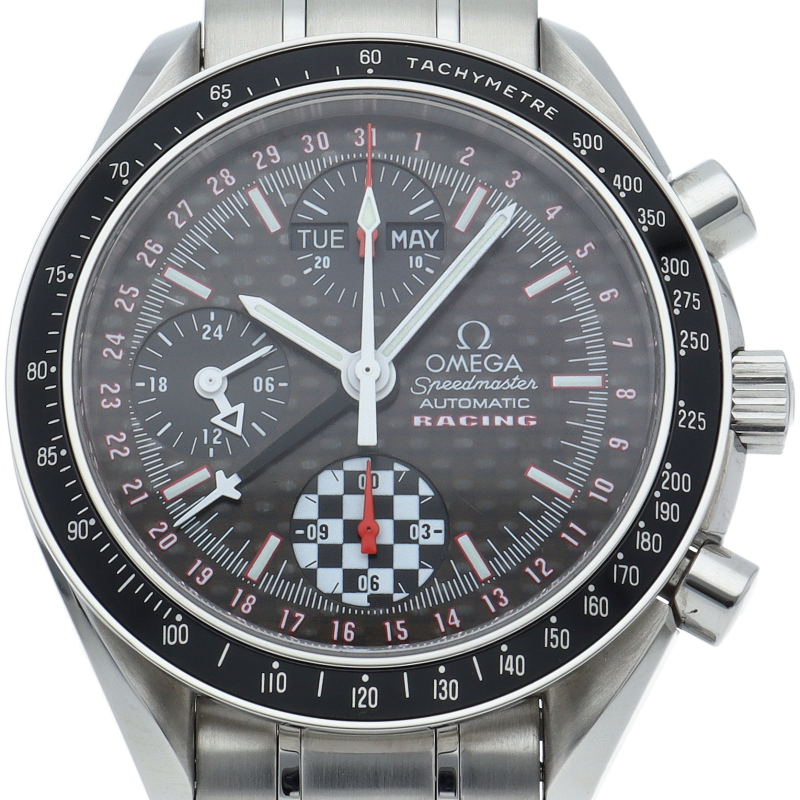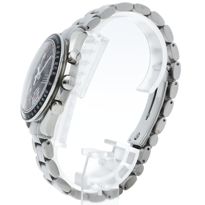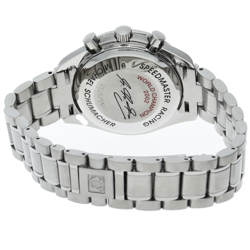 2002年のミハエル・シューマッハ限定スピードマスターです。「レーシング」の名が与えられ、チェッカーフラッグを連想させるダイヤルが特徴になっています。ケース裏にはシューマッハのサイン、“WORLD CHAMPION 2002”の刻印と限定シリアルが刻まれます。限定生産本数 「5555本」。