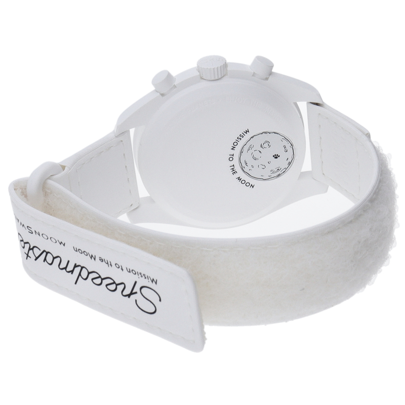 OMEGA(オメガ)とSwatch(スウォッチ)がコラボレーションした新作モデル『バイオセラミック ムーンスウォッチ ミッション トゥ ザ ムーンフェイズ』です。こちらは、オールホワイトのケースとダイヤルにさり気なく描かれたスヌーピーが特徴の一本です。