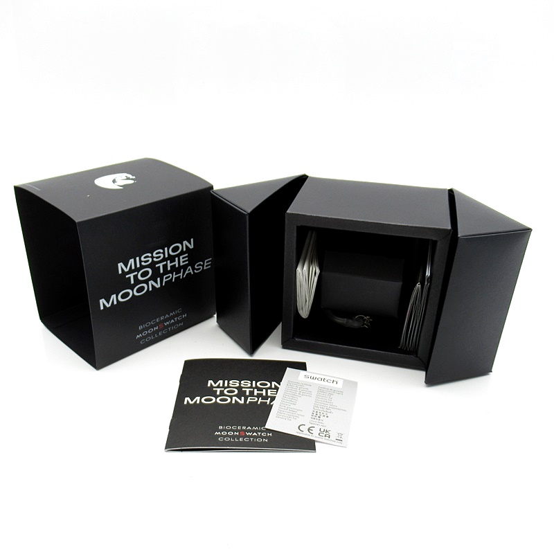 OMEGA(オメガ)とSwatch(スウォッチ)がコラボレーションした新作モデル『バイオセラミック ムーンスウォッチ ミッション トゥ ザ ムーンフェイズ』です。こちらは、オールブラックのケースとダイヤルにさり気なく描かれたスヌーピーが特徴の一本です。初期購入時に付属する貴重なブラックライト付きモデル。