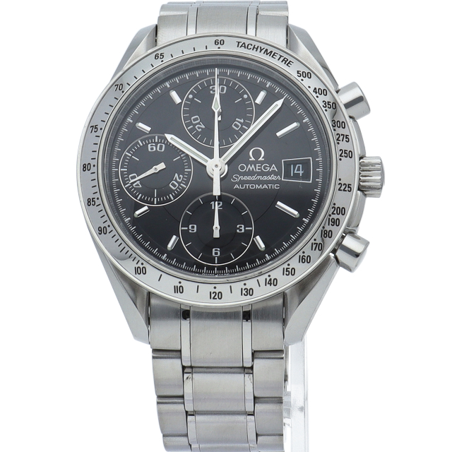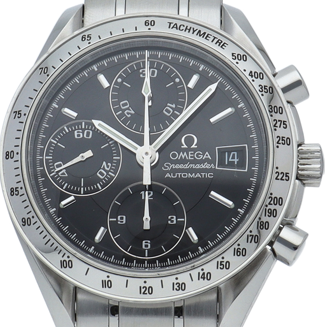 オメガの代表的な人気シリーズ「スピードマスターデイト」。クロノグラフ・デイト表示機能付きと便利で実用性のある1本です。