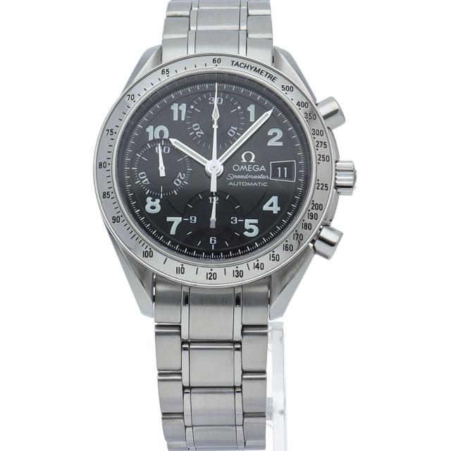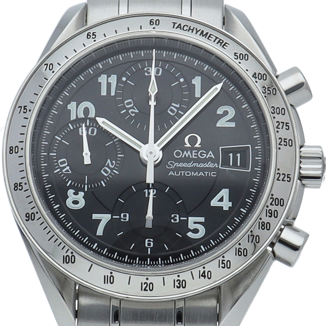 オメガの代表的な人気シリーズ「スピードマスター・デイト」。クロノグラフ・デイト表示機能付きと便利で実用性のある1本です。ブラックフェイスにアラビア数字のインデックスを配した日本限定モデルです。