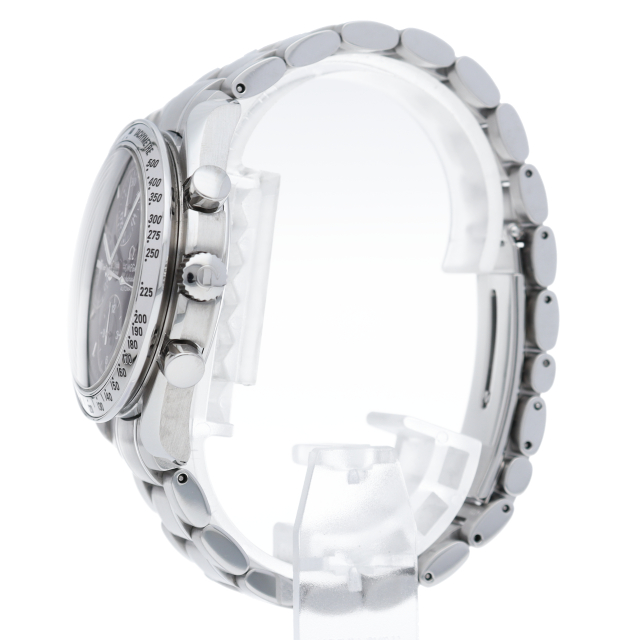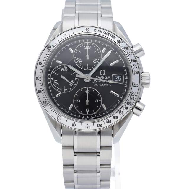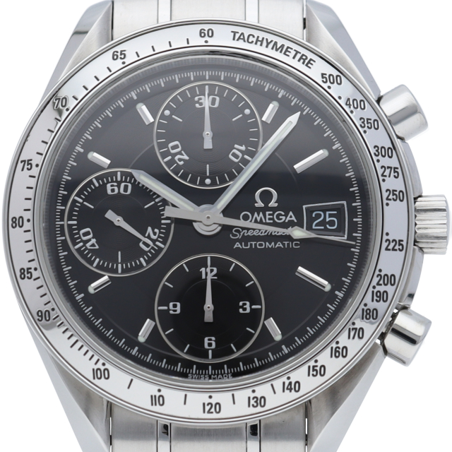 オメガの代表的な人気シリーズ「スピードマスターデイト」。クロノグラフ・デイト表示機能付きと便利で実用性のある1本です。