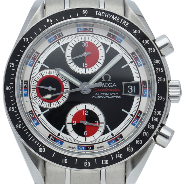 オメガの代表的な人気シリーズ「スピードマスター デイト」。クロノグラフ・デイト表示機能付きと便利で実用性のある1本です。カラフルな文字盤色が、まわりと少し差を付けたい方にうってつけの1本です。