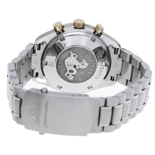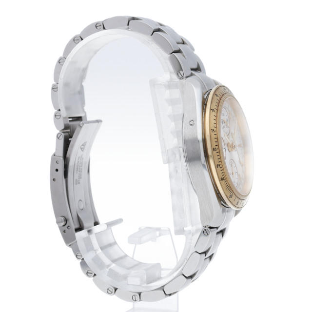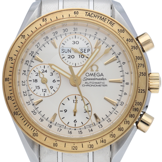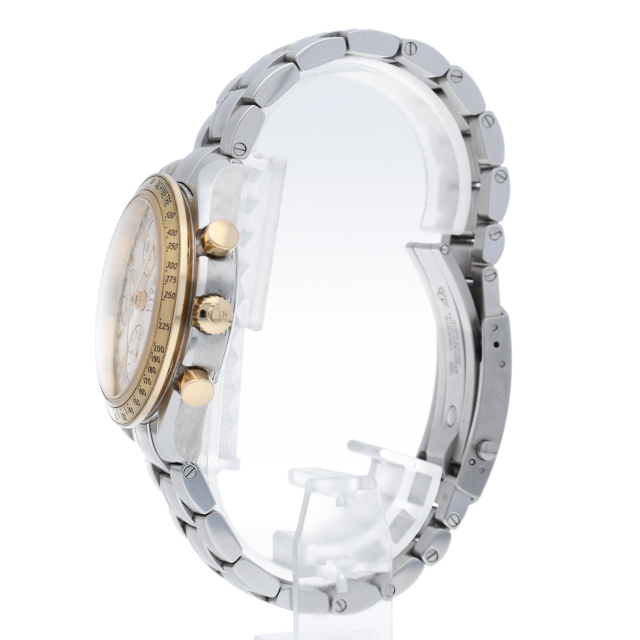 2007年より販売された新型スピードマスタートリプルカレンダー。40ミリケースにサイズアップした新世代のスピードマスターです。ムーブメントはクロノメーター検定を取得したCal1164を搭載。ベゼルとプッシュボタンにはイエローゴールドを使い、エレガントな雰囲気を演出しています。