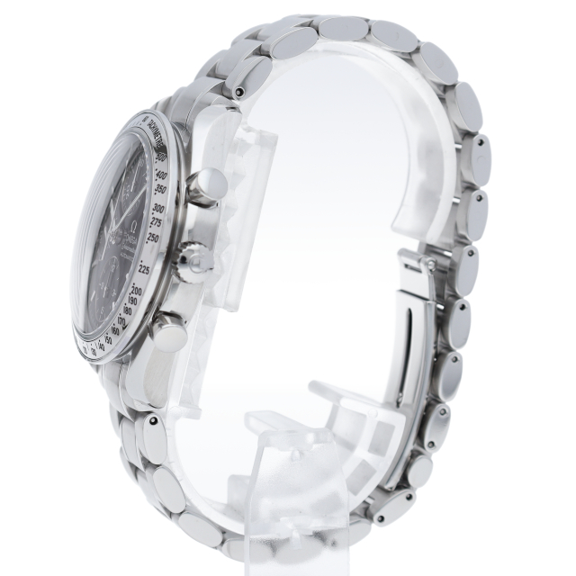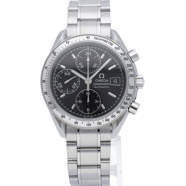 オメガの代表的な人気シリーズ「スピードマスターデイト」。クロノグラフ・デイト表示機能付きと便利で実用性のある1本です。