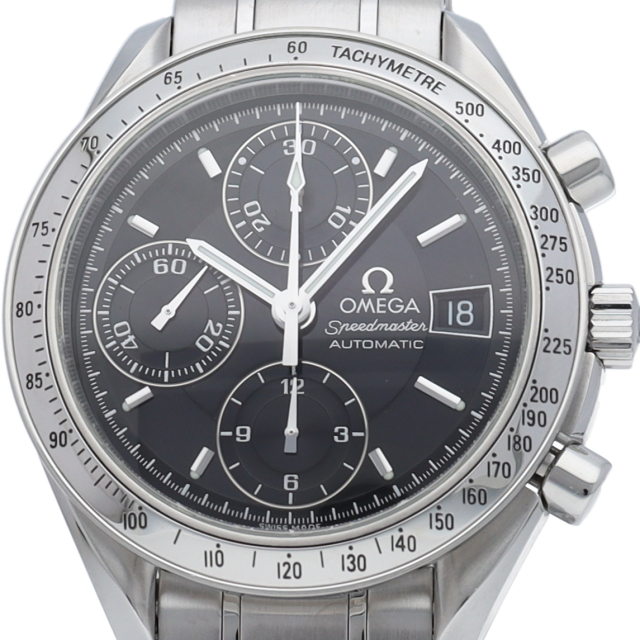 オメガの代表的な人気シリーズ「スピードマスターデイト」。クロノグラフ・デイト表示機能付きと便利で実用性のある1本です。