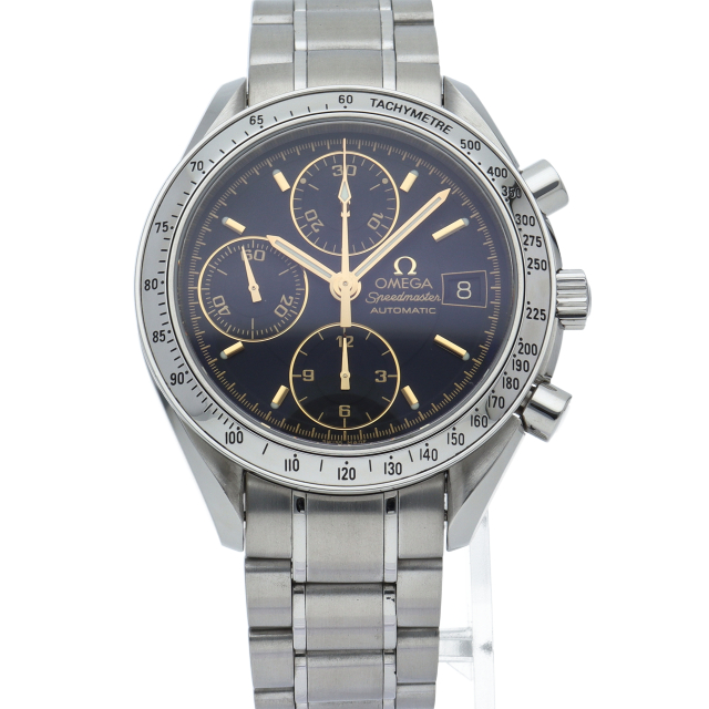 オメガの代表的な人気シリーズ「スピードマスター・デイト」。クロノグラフ・デイト表示機能付きと便利で実用性のある1本です。日本限定のインデックスがゴールドの人気モデルです。
