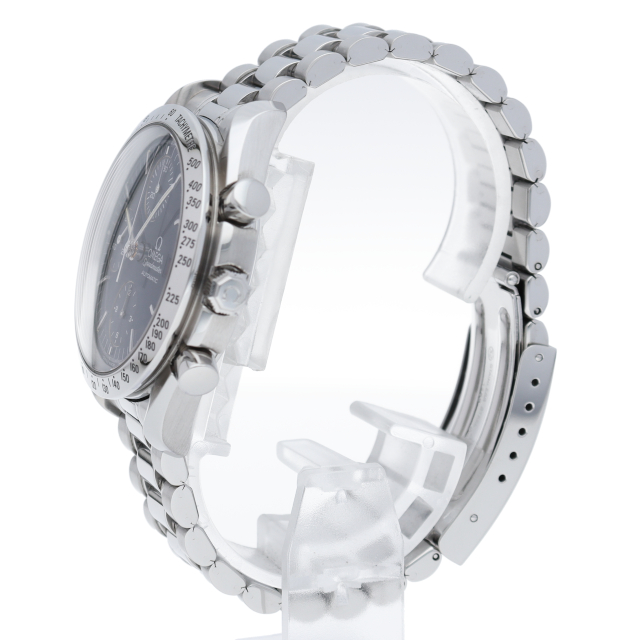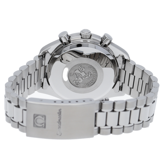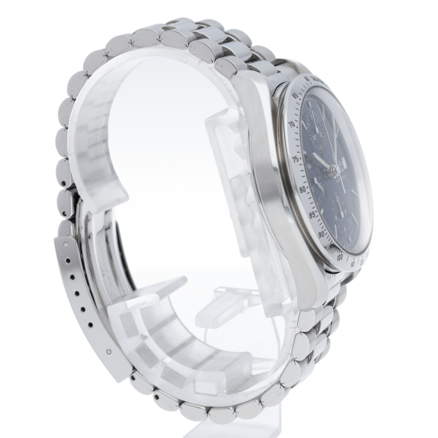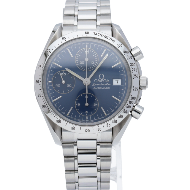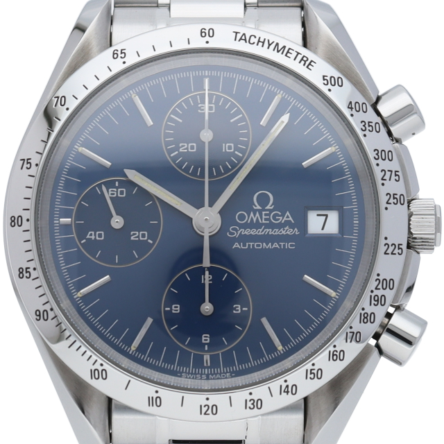 オメガの代表的な人気シリーズ「スピードマスターデイト」。クロノグラフ・デイト表示機能付きと便利で実用性のある1本です。日本限定モデル。