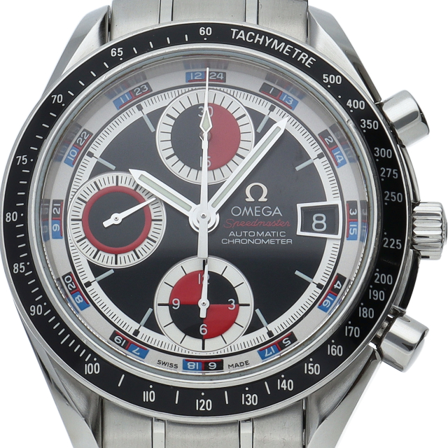 オメガの代表的な人気シリーズ「スピードマスター デイト」。クロノグラフ・デイト表示機能付きと便利で実用性のある1本です。カラフルな文字盤色が、まわりと少し差を付けたい方にうってつけの1本です。