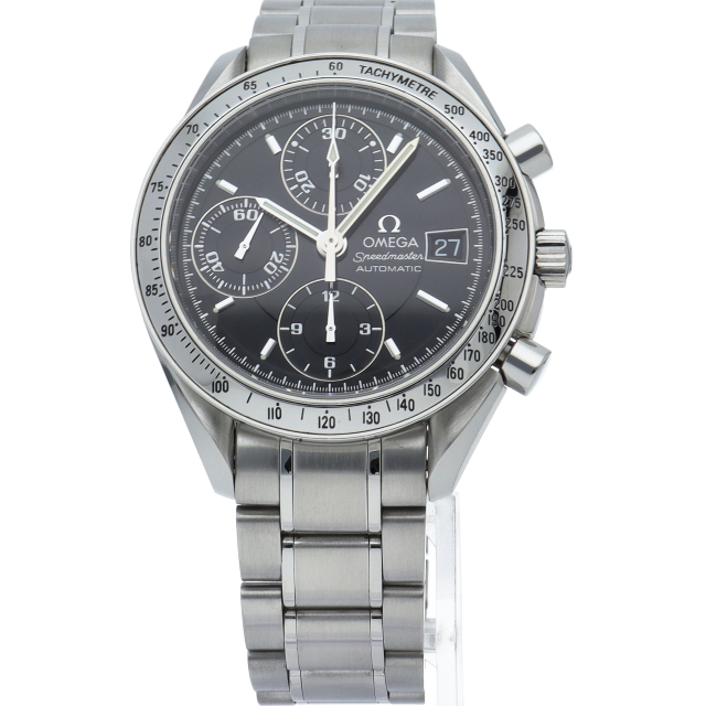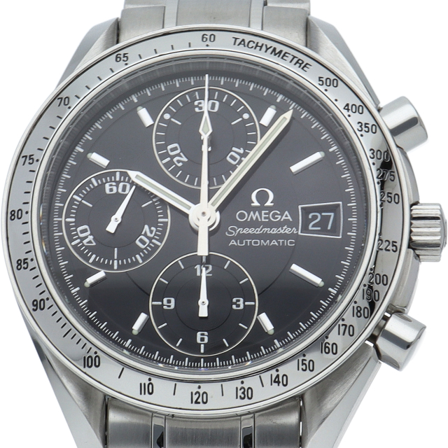 オメガの代表的な人気シリーズ「スピードマスターデイト」。クロノグラフ・デイト表示機能付きと便利で実用性のある1本です。
