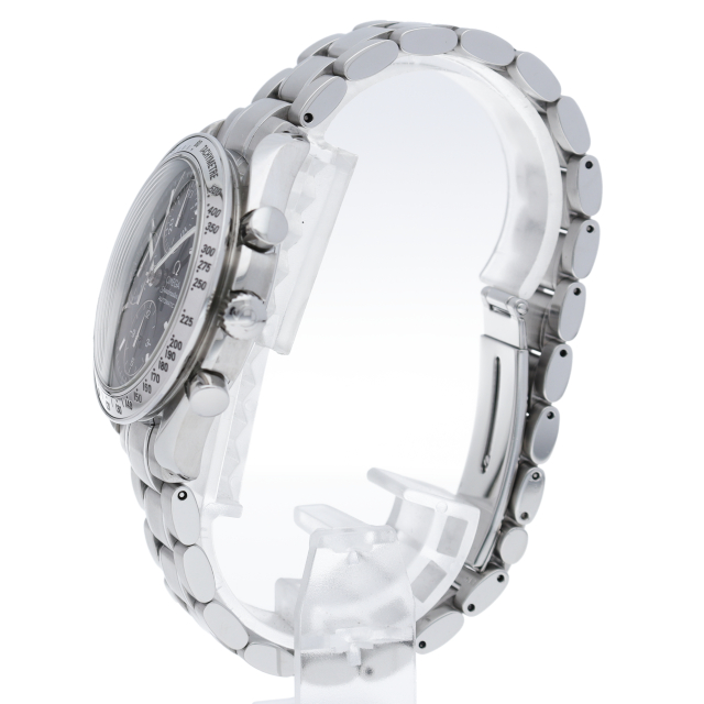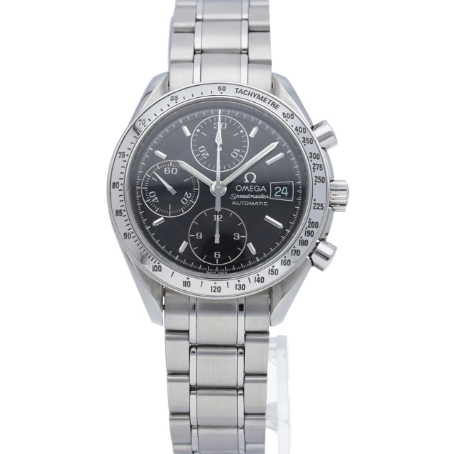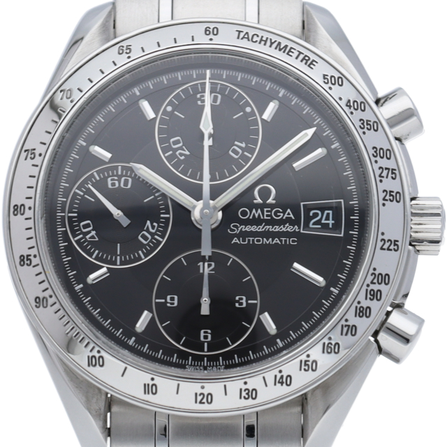 オメガの代表的な人気シリーズ「スピードマスターデイト」。クロノグラフ・デイト表示機能付きと便利で実用性のある1本です。