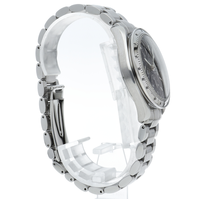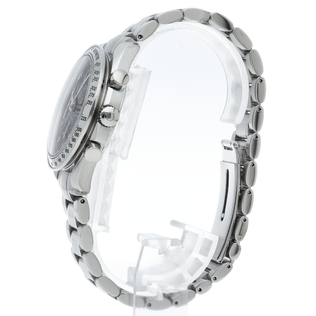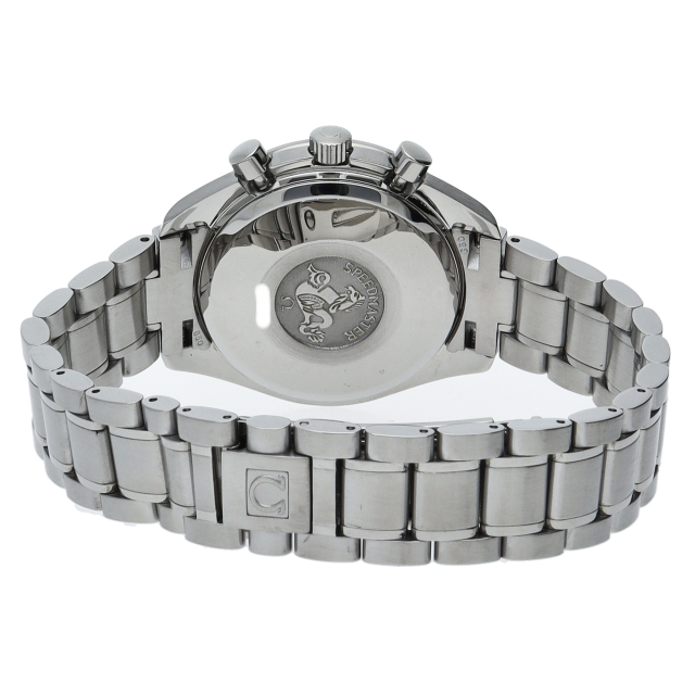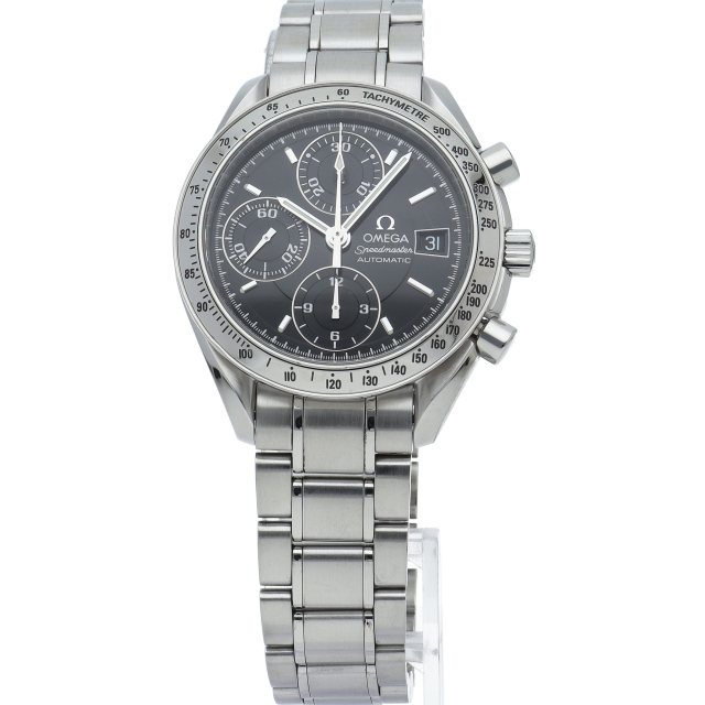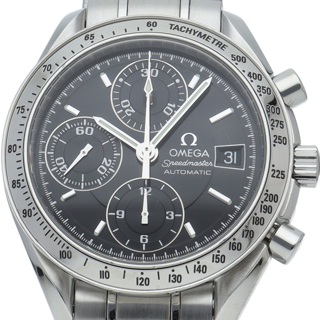 オメガの代表的な人気シリーズ「スピードマスターデイト」。クロノグラフ・デイト表示機能付きと便利で実用性のある1本です。