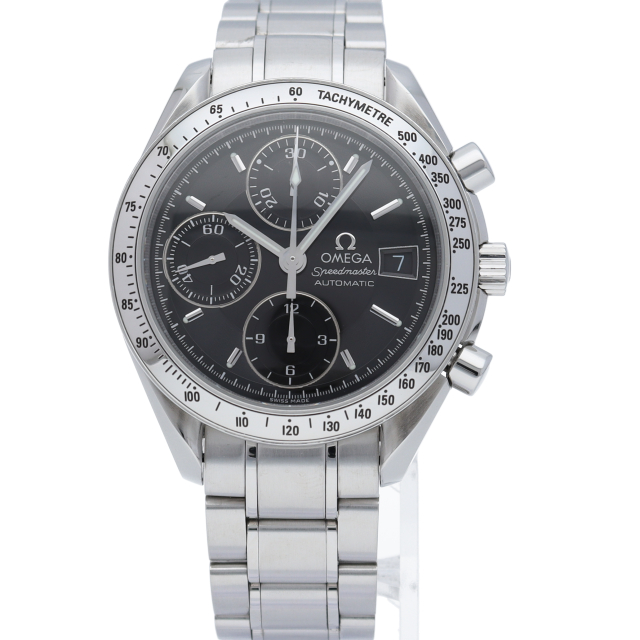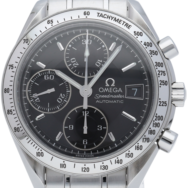 オメガの代表的な人気シリーズ「スピードマスターデイト」。クロノグラフ・デイト表示機能付きと便利で実用性のある1本です。