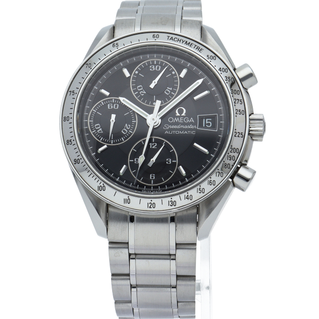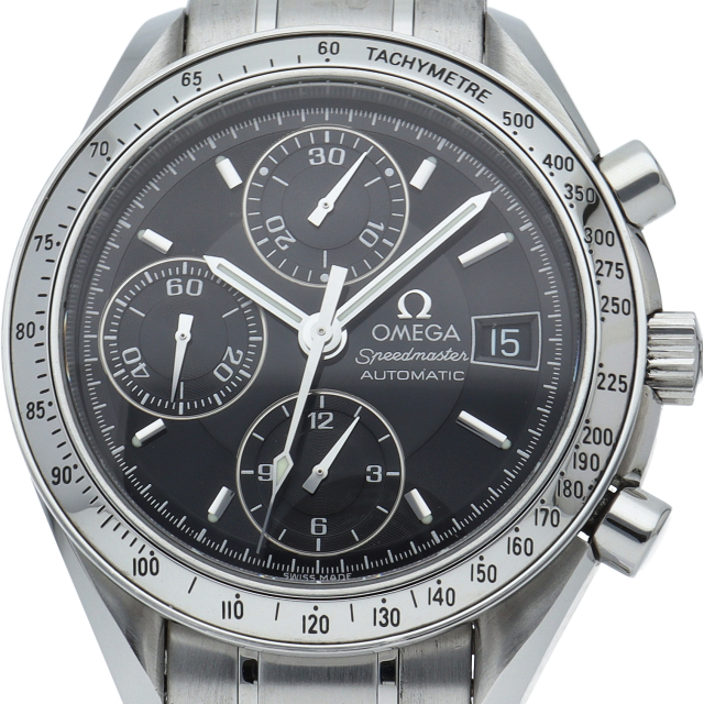 オメガの代表的な人気シリーズ「スピードマスターデイト」。クロノグラフ・デイト表示機能付きと便利で実用性のある1本です。