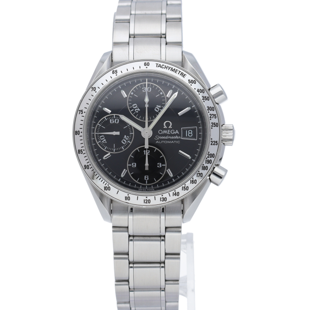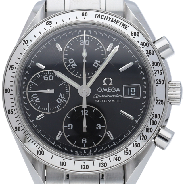 オメガの代表的な人気シリーズ「スピードマスターデイト」。クロノグラフ・デイト表示機能付きと便利で実用性のある1本です。