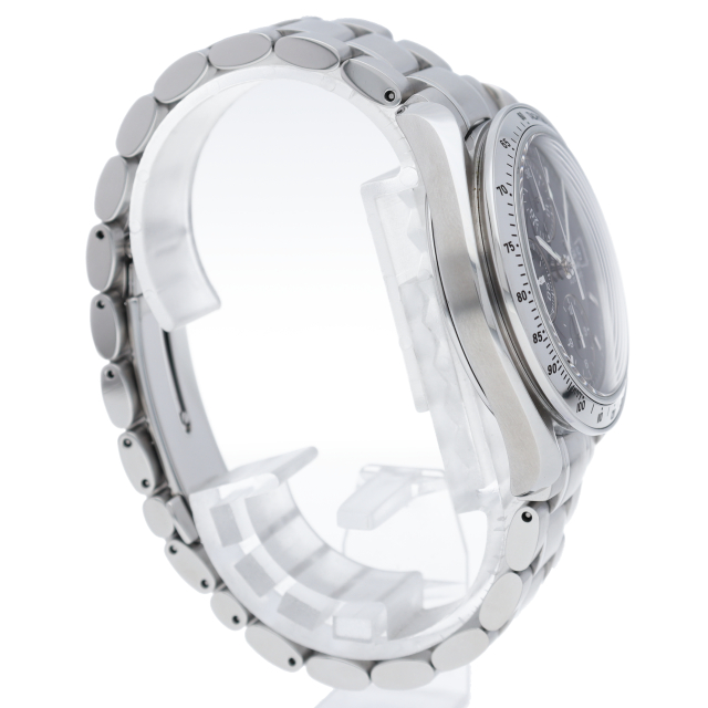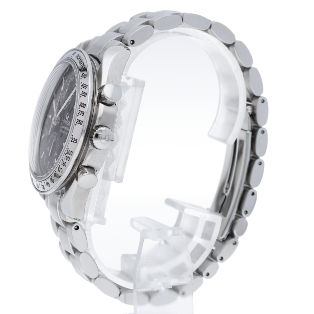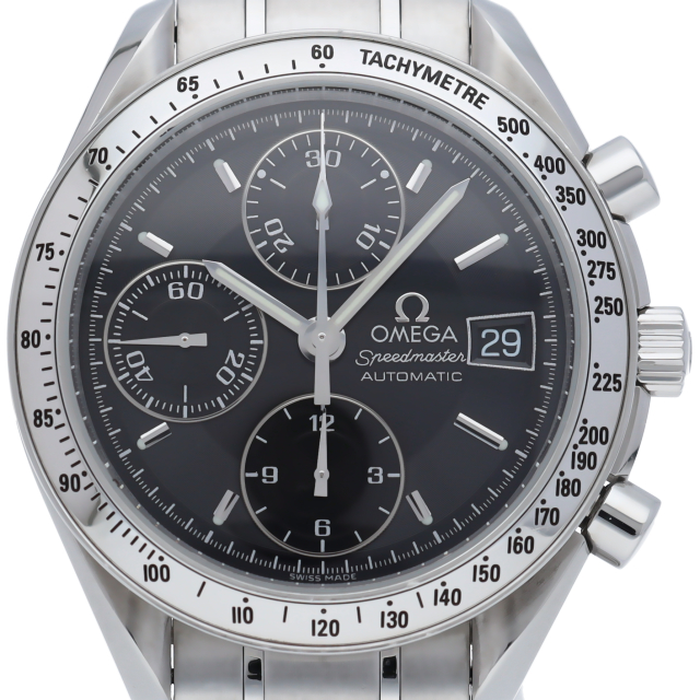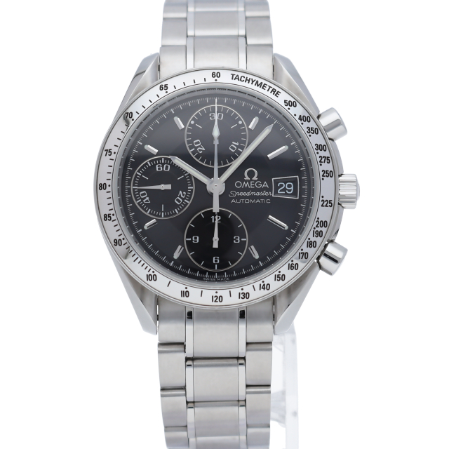 オメガの代表的な人気シリーズ「スピードマスターデイト」。クロノグラフ・デイト表示機能付きと便利で実用性のある1本です。