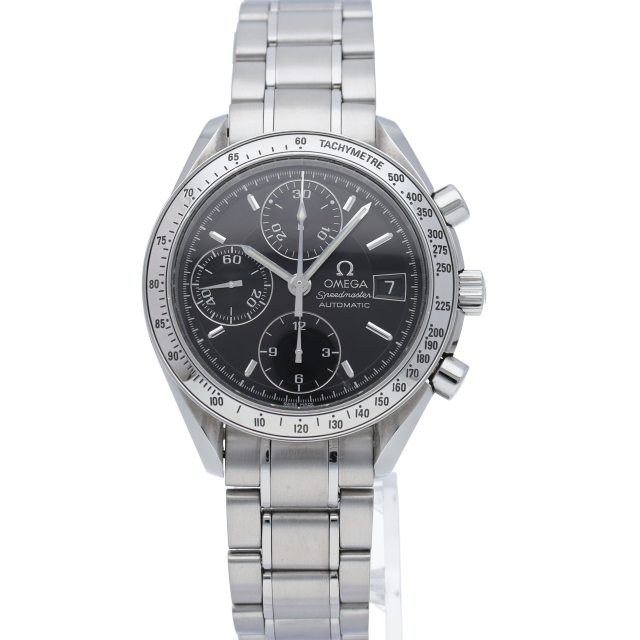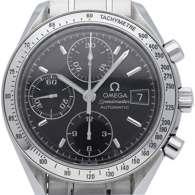オメガの代表的な人気シリーズ「スピードマスターデイト」。クロノグラフ・デイト表示機能付きと便利で実用性のある1本です。