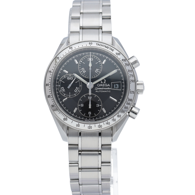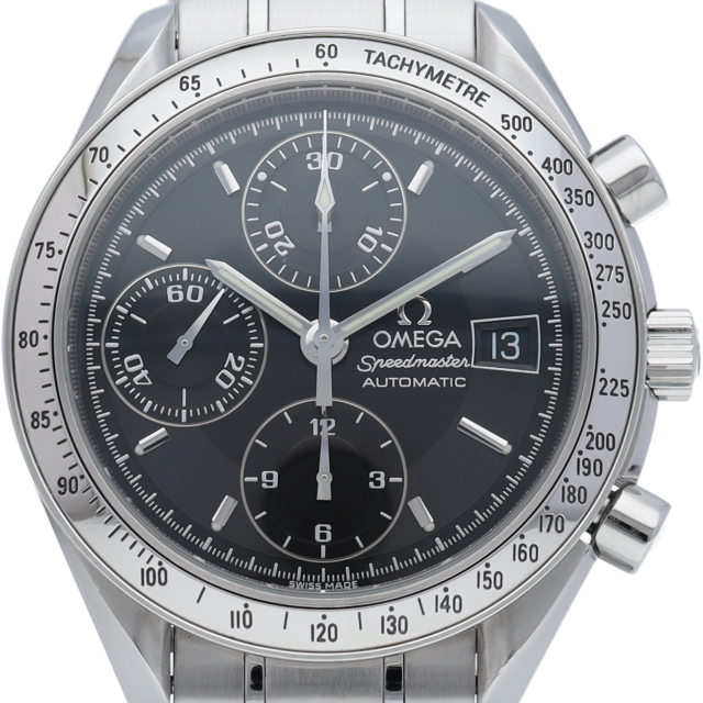 オメガの代表的な人気シリーズ「スピードマスターデイト」。クロノグラフ・デイト表示機能付きと便利で実用性のある1本です。