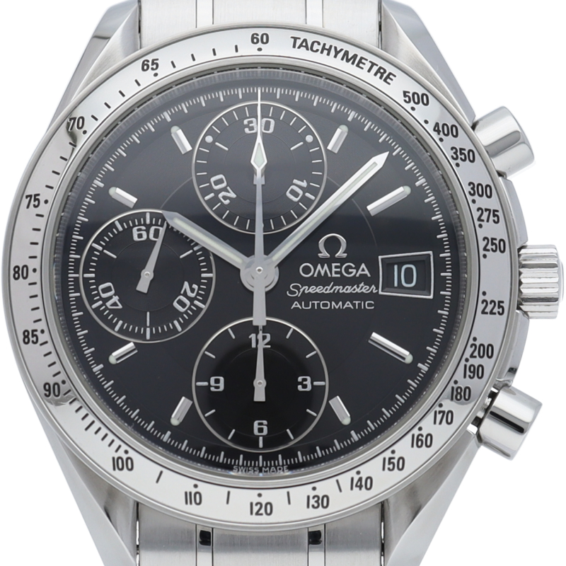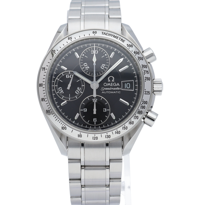 オメガの代表的な人気シリーズ「スピードマスターデイト」。クロノグラフ・デイト表示機能付きと便利で実用性のある1本です。