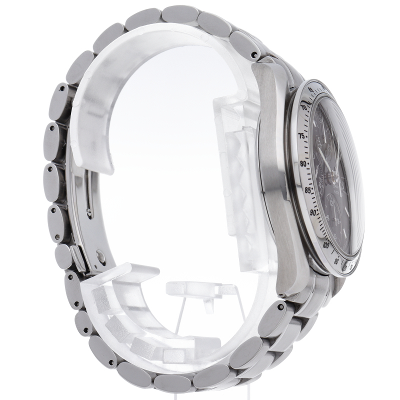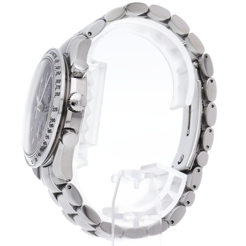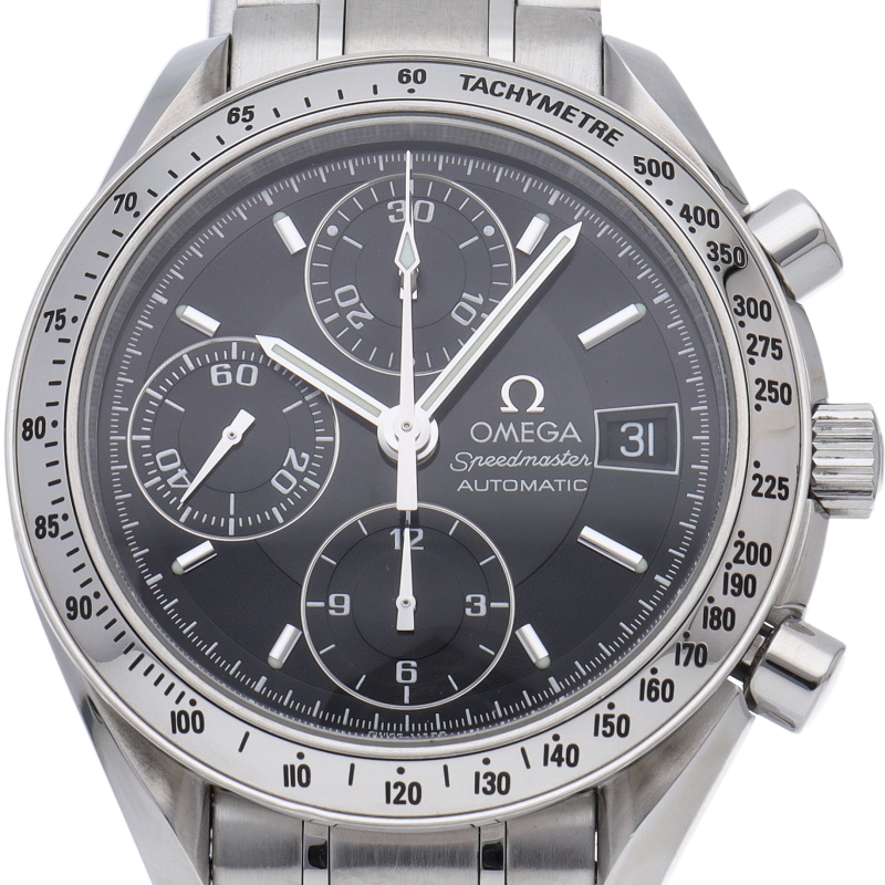 オメガの代表的な人気シリーズ「スピードマスターデイト」。クロノグラフ・デイト表示機能付きと便利で実用性のある1本です。