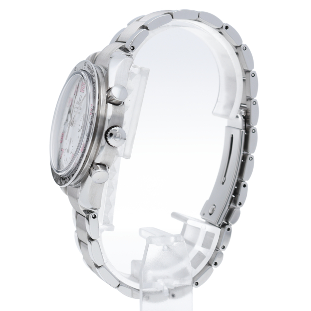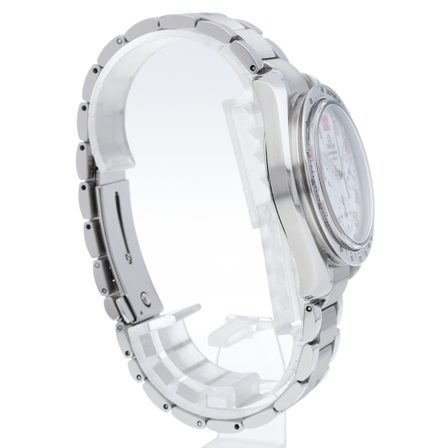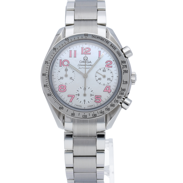 オメガの代表的な人気シリーズ「スピードマスター」。鮮やかなホワイトシェル文字盤にピンクのアラビアインデックスが珍しい逸品。
