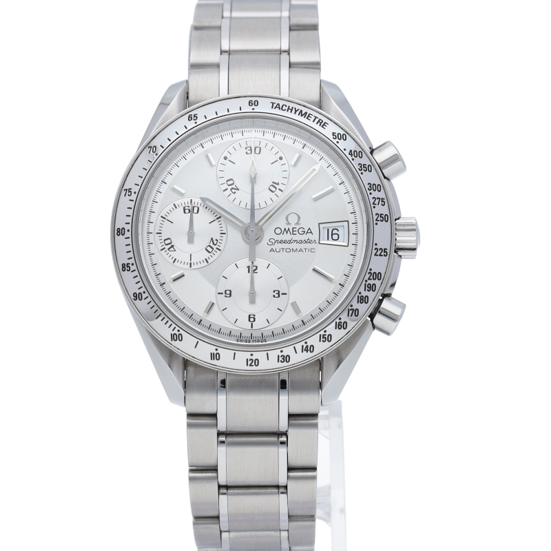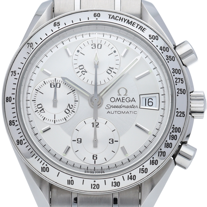 オメガの代表的な人気シリーズ「スピードマスターデイト」。クロノグラフ・デイト表示機能付きと便利で実用性のある1本です。