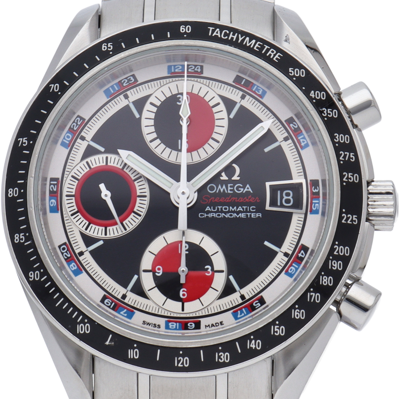 オメガの代表的な人気シリーズ「スピードマスター デイト」。クロノグラフ・デイト表示機能付きと便利で実用性のある1本です。カラフルな文字盤色が、まわりと少し差を付けたい方にうってつけの1本です。