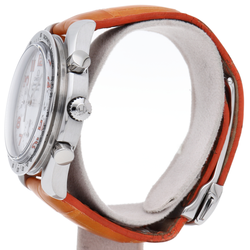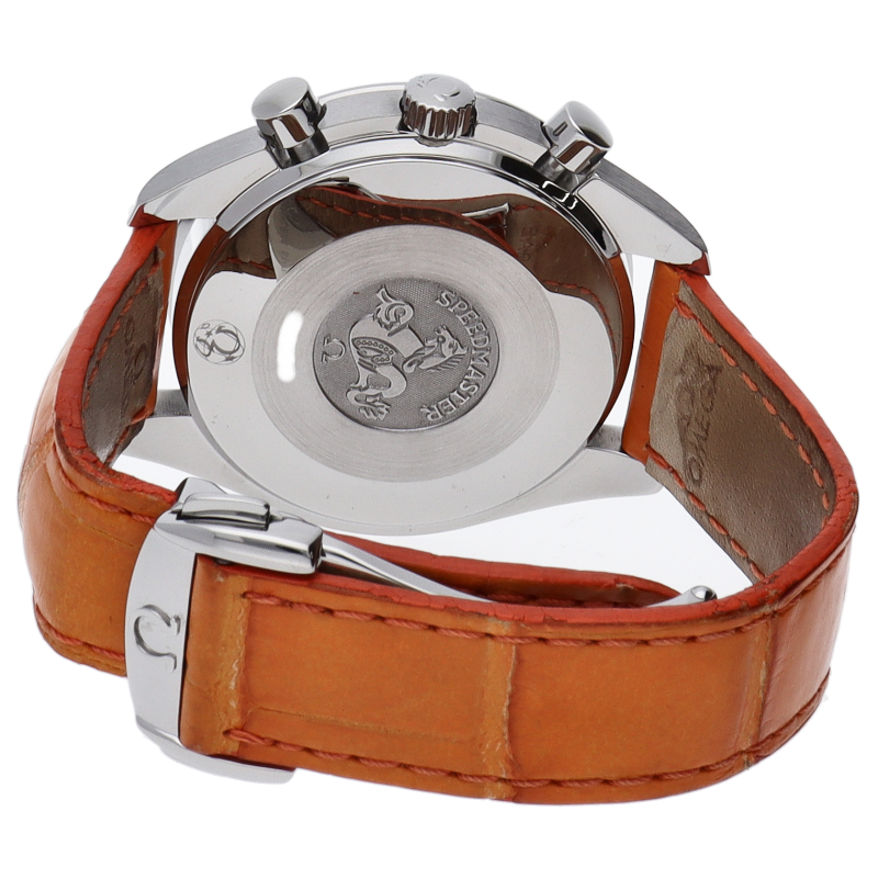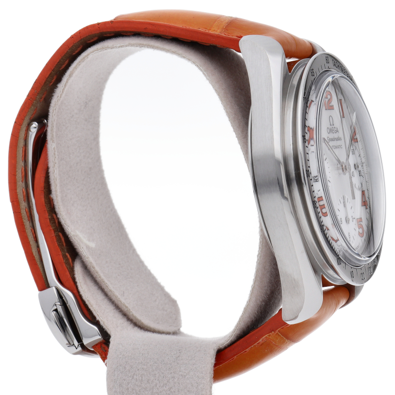 オメガの代表的な人気シリーズ「スピードマスター」。鮮やかなホワイトシェル文字盤にオレンジのアラビアインデックスが珍しい逸品。