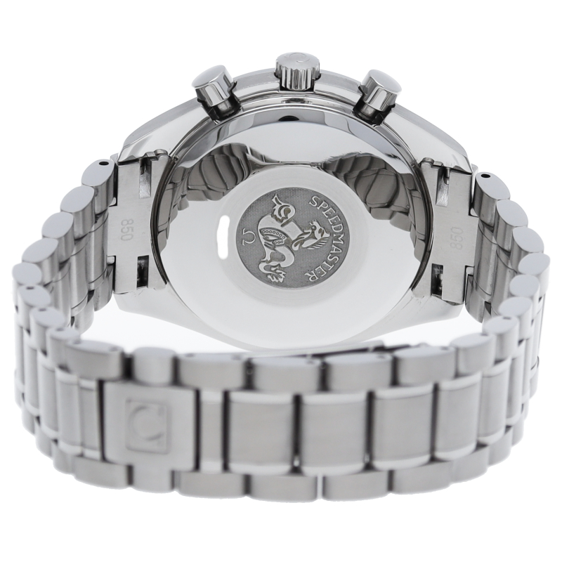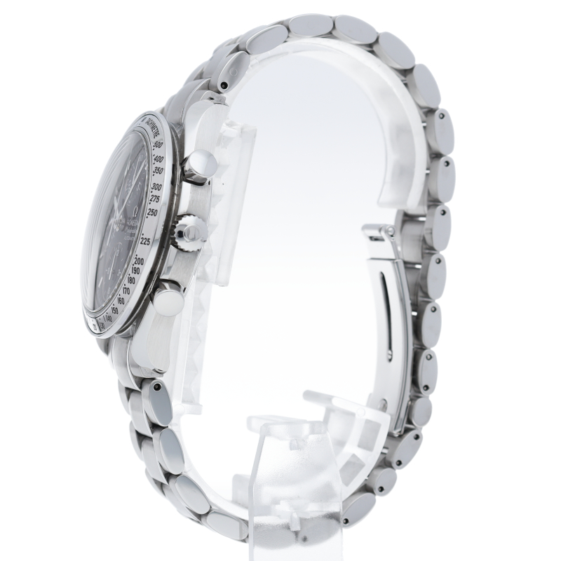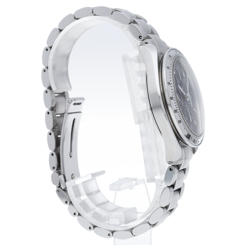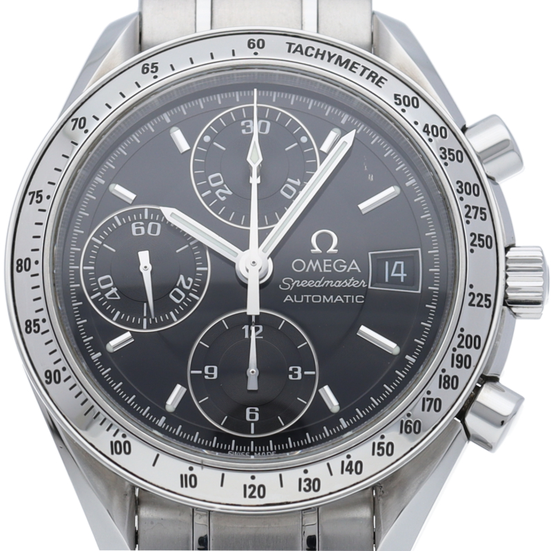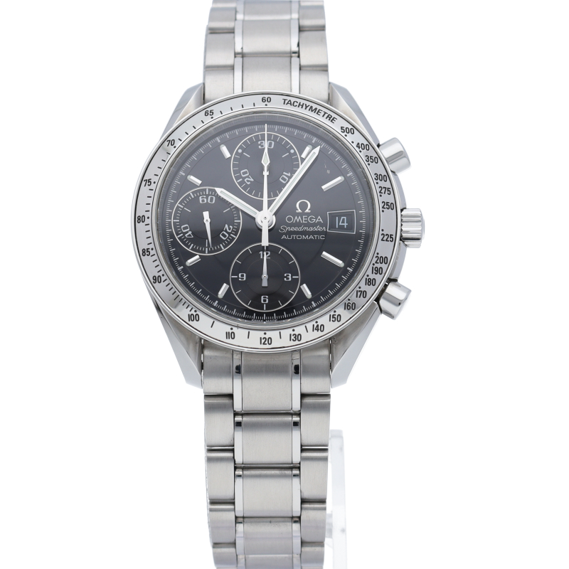オメガの代表的な人気シリーズ「スピードマスターデイト」。クロノグラフ・デイト表示機能付きと便利で実用性のある1本です。
