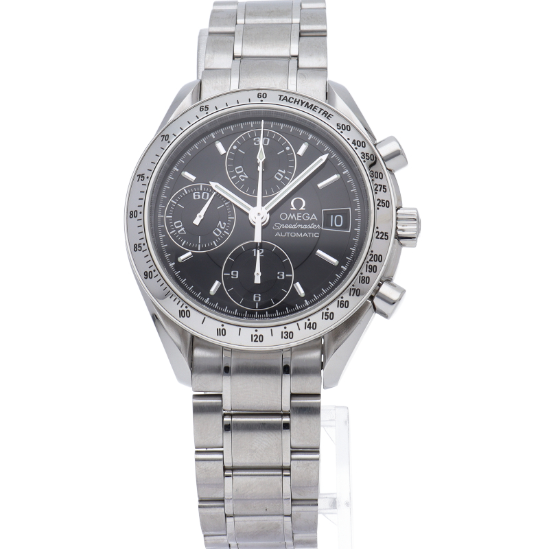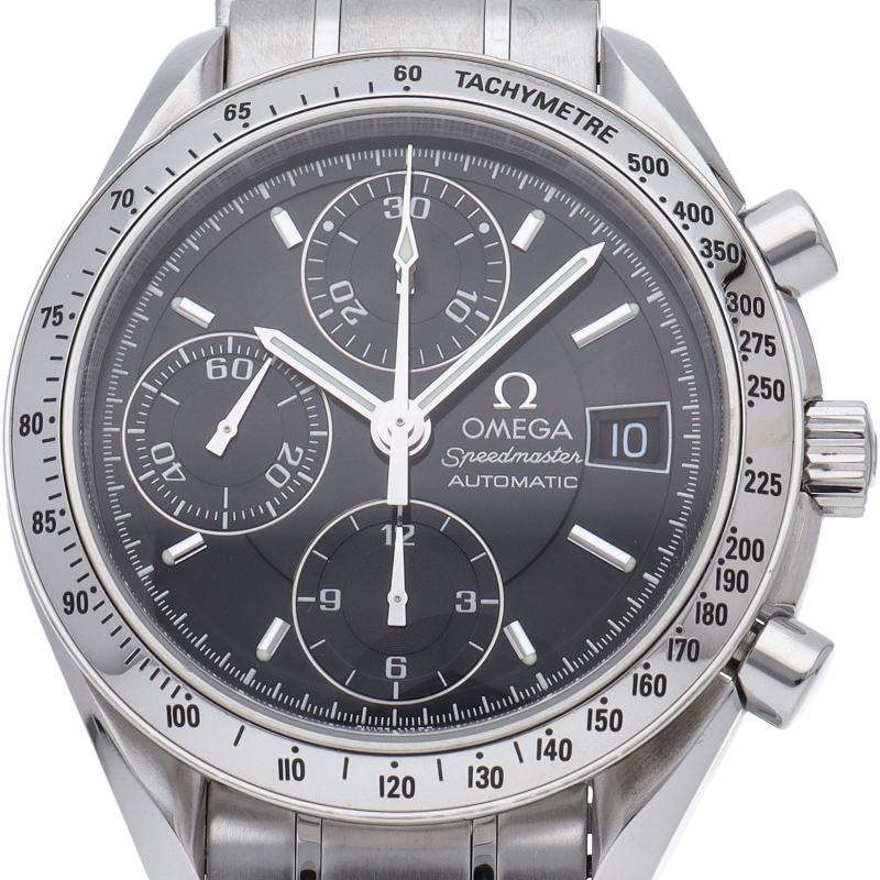 オメガの代表的な人気シリーズ「スピードマスターデイト」。クロノグラフ・デイト表示機能付きと便利で実用性のある1本です。