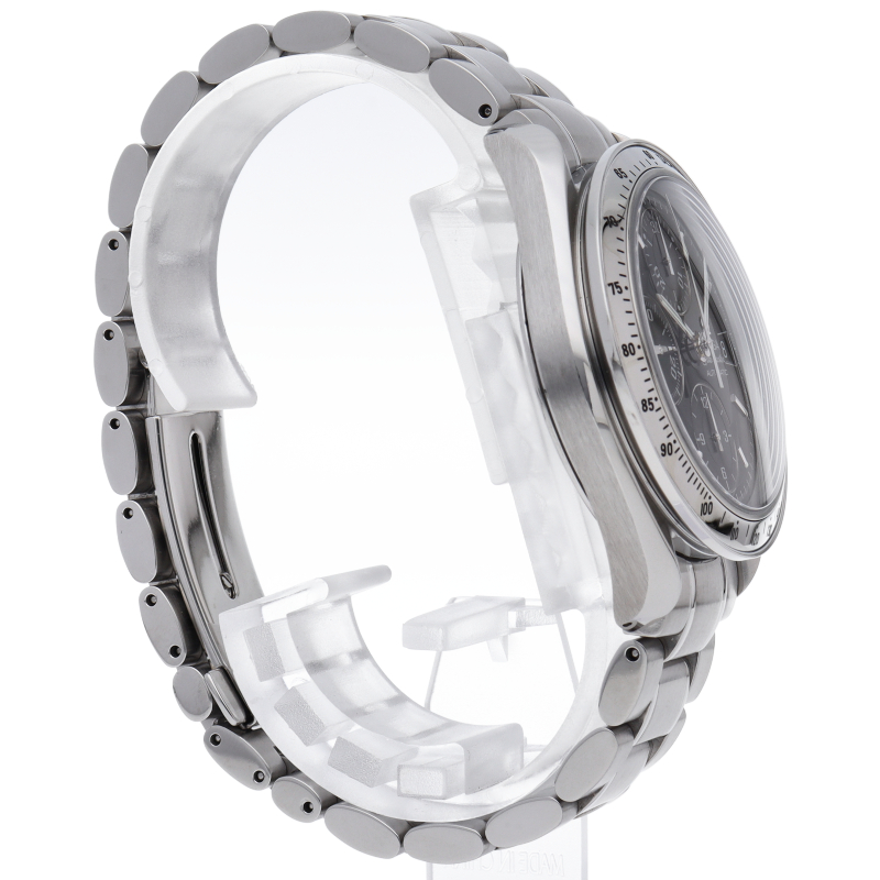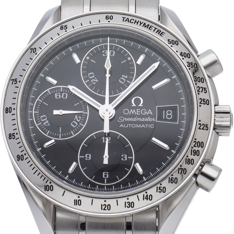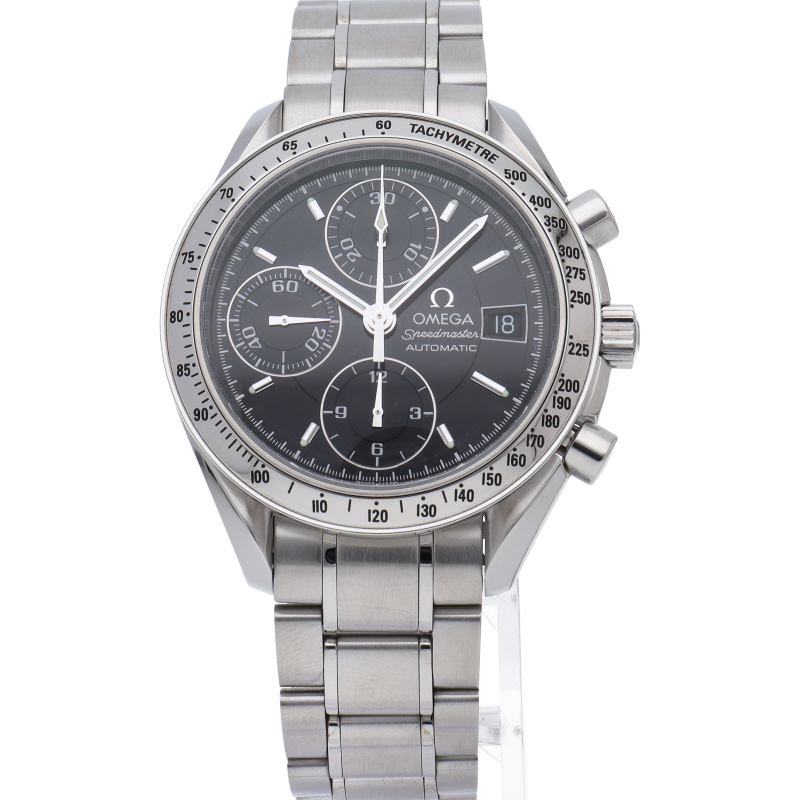オメガの代表的な人気シリーズ「スピードマスターデイト」。クロノグラフ・デイト表示機能付きと便利で実用性のある1本です。