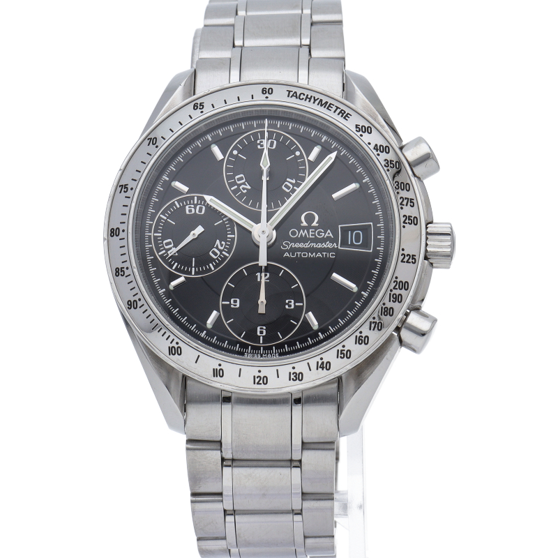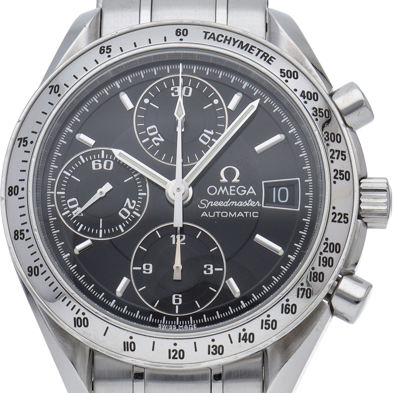 オメガの代表的な人気シリーズ「スピードマスターデイト」。クロノグラフ・デイト表示機能付きと便利で実用性のある1本です。