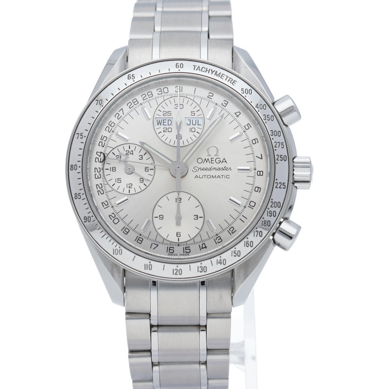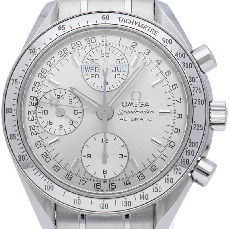 オメガの人気ウォッチ「スピードマスター」。クロノグラフ、月・日・曜日表示機能がついた便利な多機能ウォッチ。