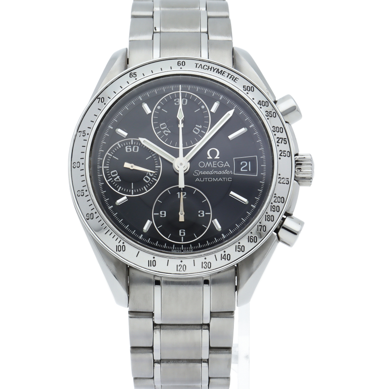 オメガの代表的な人気シリーズ「スピードマスターデイト」。クロノグラフ・デイト表示機能付きと便利で実用性のある1本です。