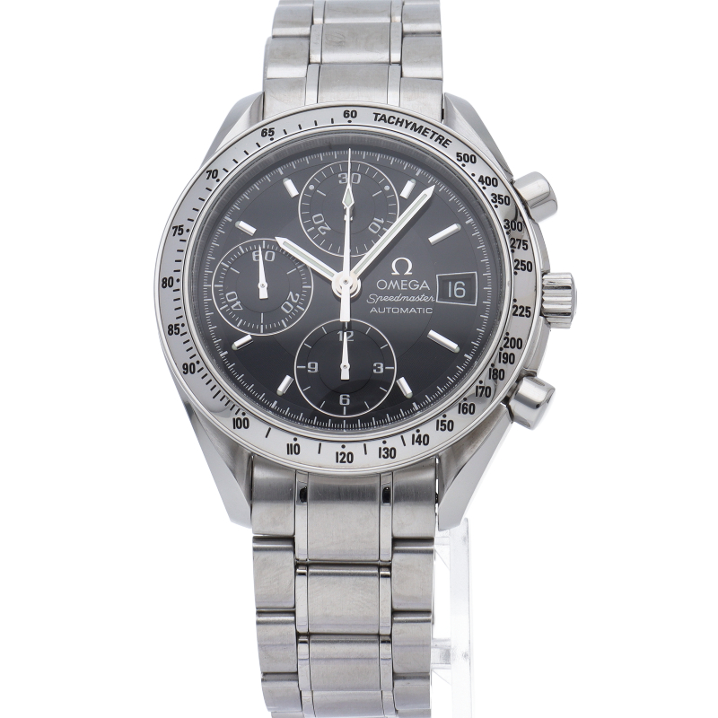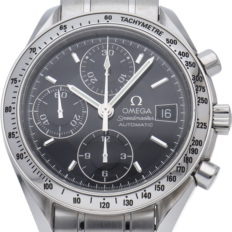 オメガの代表的な人気シリーズ「スピードマスターデイト」。クロノグラフ・デイト表示機能付きと便利で実用性のある1本です。
