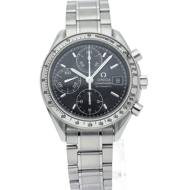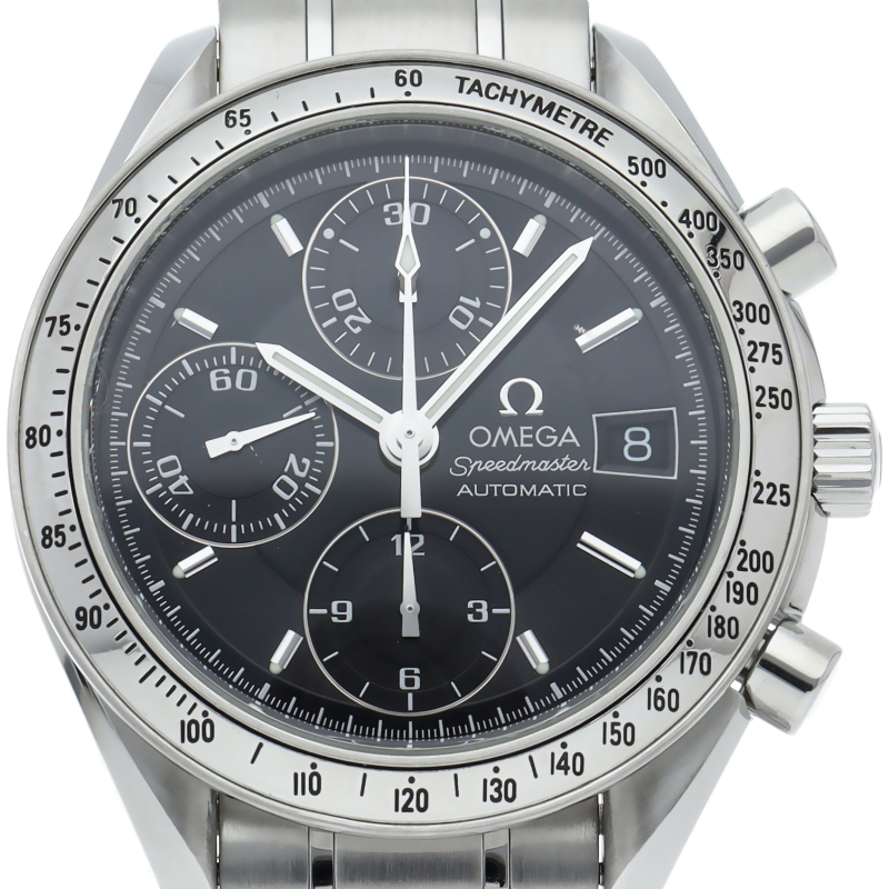 オメガの代表的な人気シリーズ「スピードマスターデイト」。クロノグラフ・デイト表示機能付きと便利で実用性のある1本です。