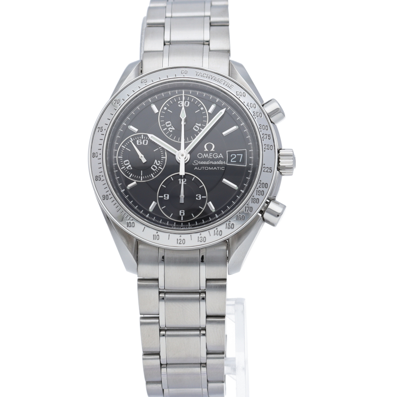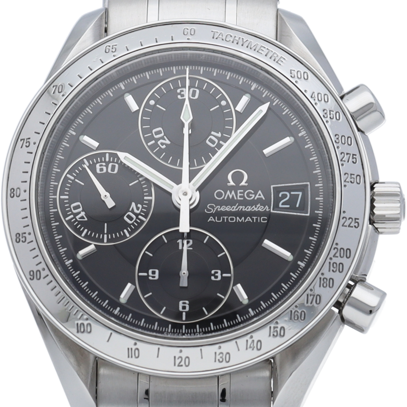 オメガの代表的な人気シリーズ「スピードマスターデイト」。クロノグラフ・デイト表示機能付きと便利で実用性のある1本です。
