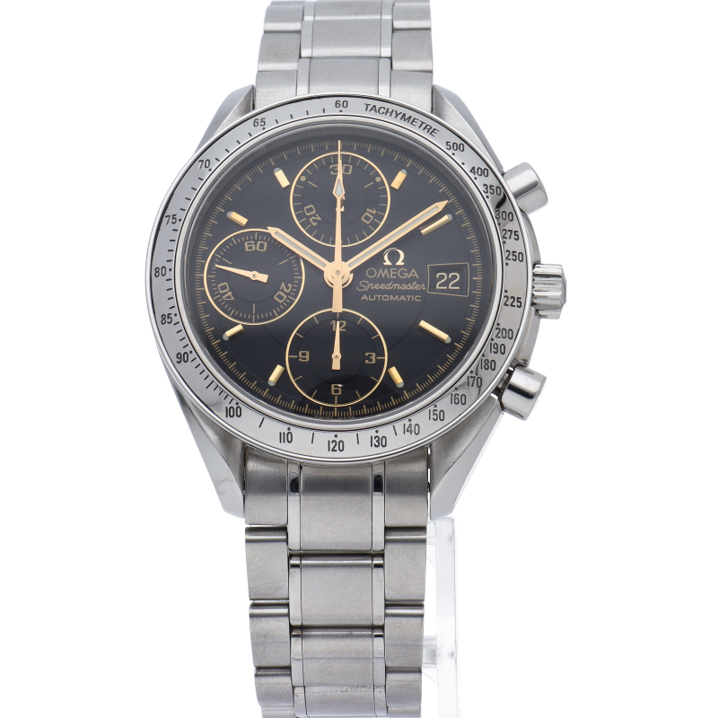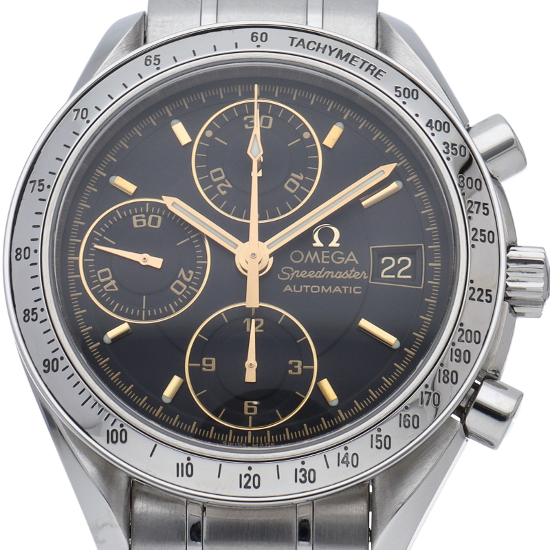 オメガの代表的な人気シリーズ「スピードマスター・デイト」。クロノグラフ・デイト表示機能付きと便利で実用性のある1本です。日本限定のインデックスがゴールドの人気モデルです。