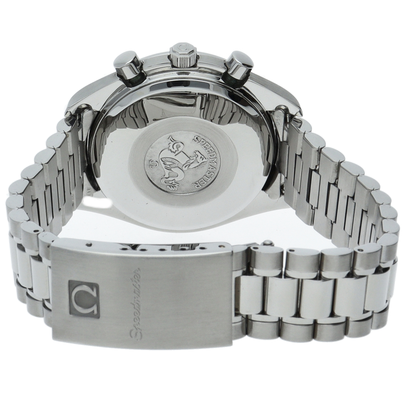オメガの代表的な人気シリーズ「スピードマスターデイト」。クロノグラフ・デイト表示機能付きと便利で実用性のある1本です。日本限定モデル。