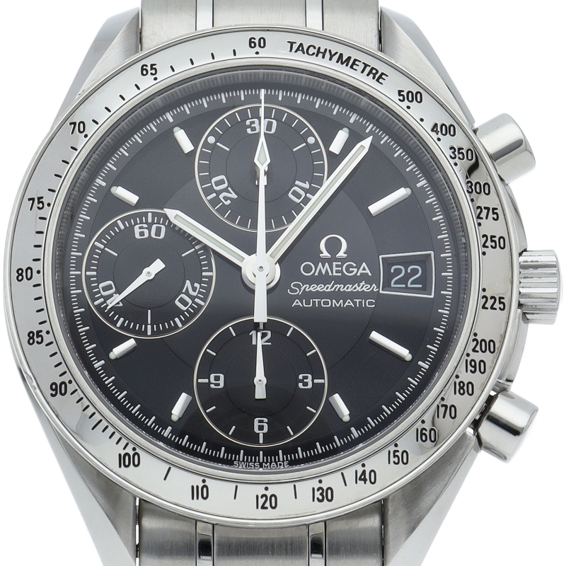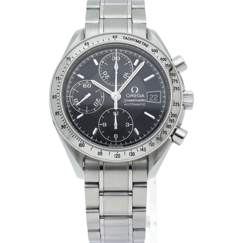 オメガの代表的な人気シリーズ「スピードマスターデイト」。クロノグラフ・デイト表示機能付きと便利で実用性のある1本です。