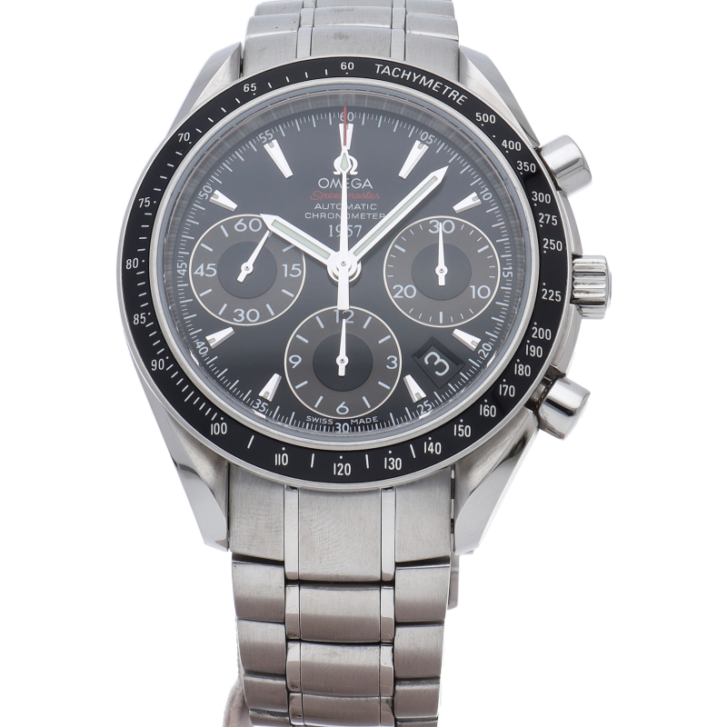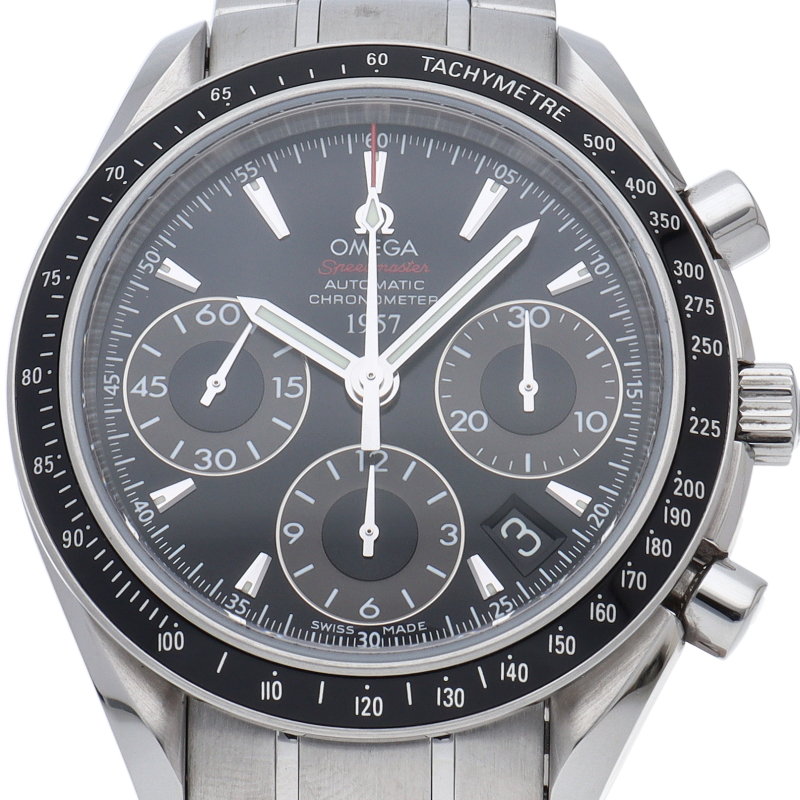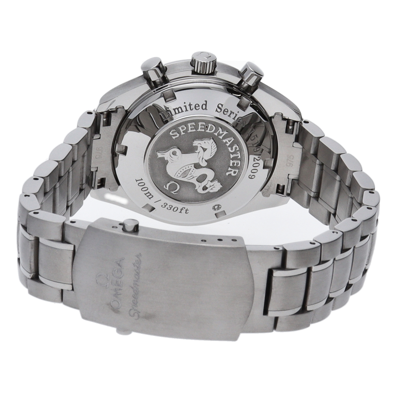 2009年に発売された日本限定モデルです。横三つ目のインダイヤル、4-5時位置に配置されたカレンダー、スピードマスター誕生の年である“1957”が表記されるなど、限定モデルらしいデザインです。
