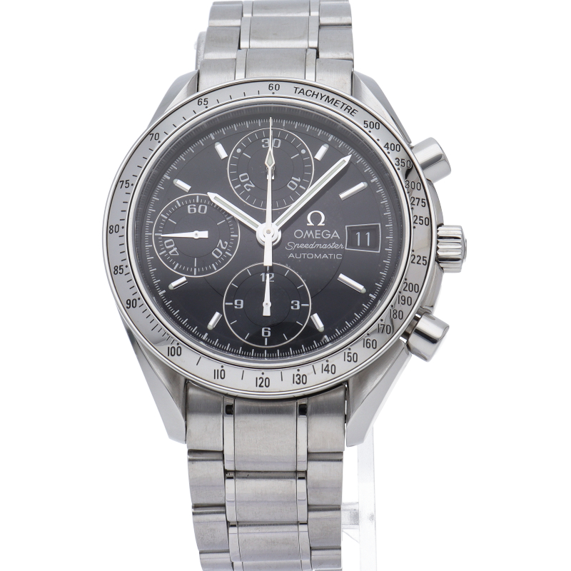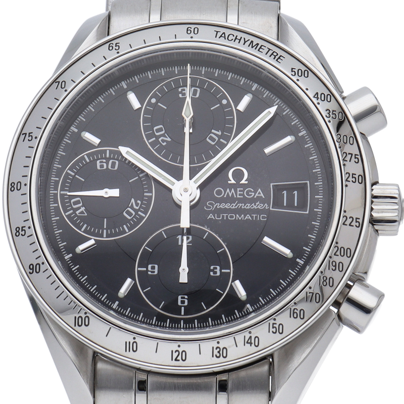 オメガの代表的な人気シリーズ「スピードマスターデイト」。クロノグラフ・デイト表示機能付きと便利で実用性のある1本です。
