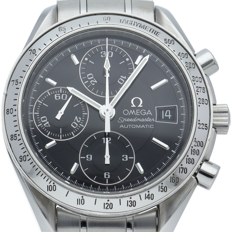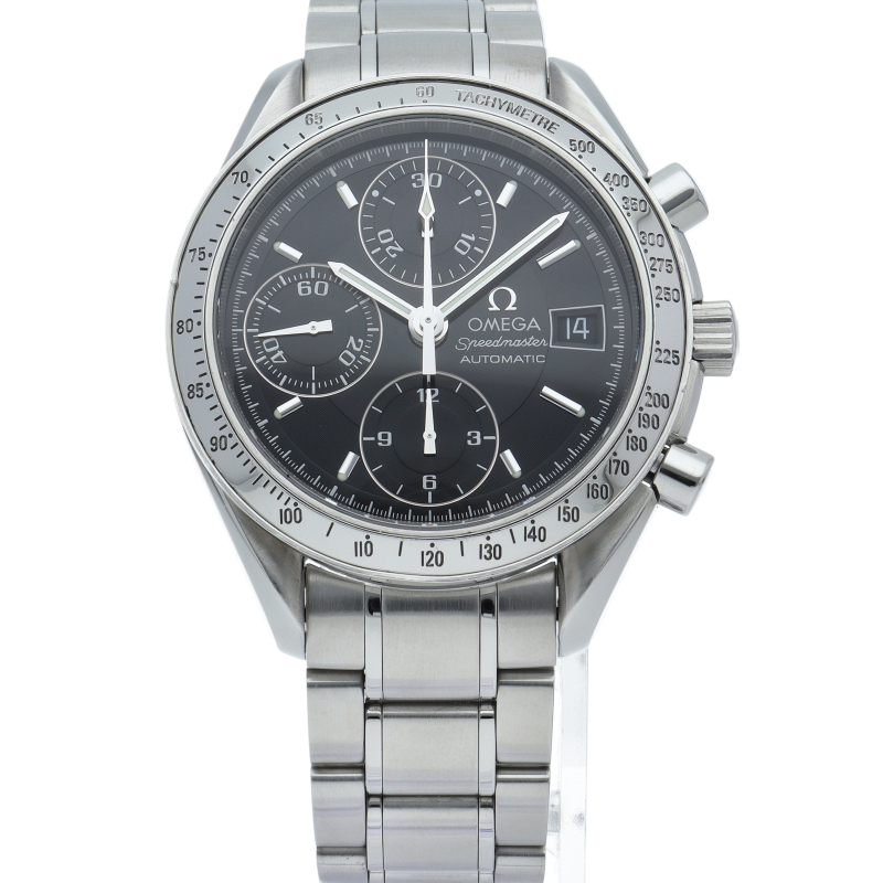 オメガの代表的な人気シリーズ「スピードマスターデイト」。クロノグラフ・デイト表示機能付きと便利で実用性のある1本です。