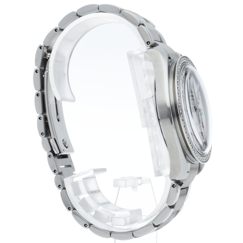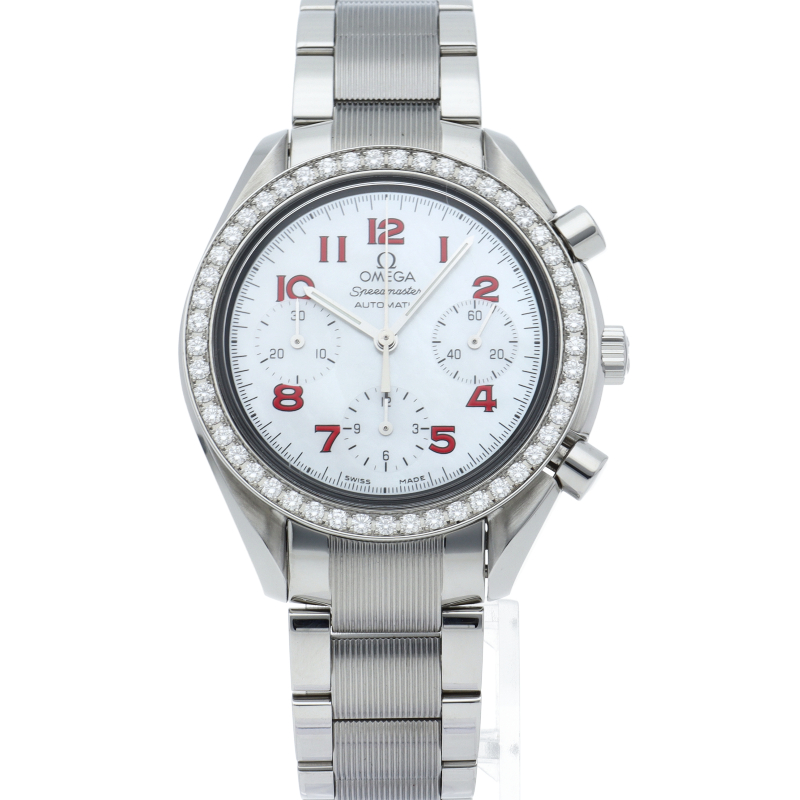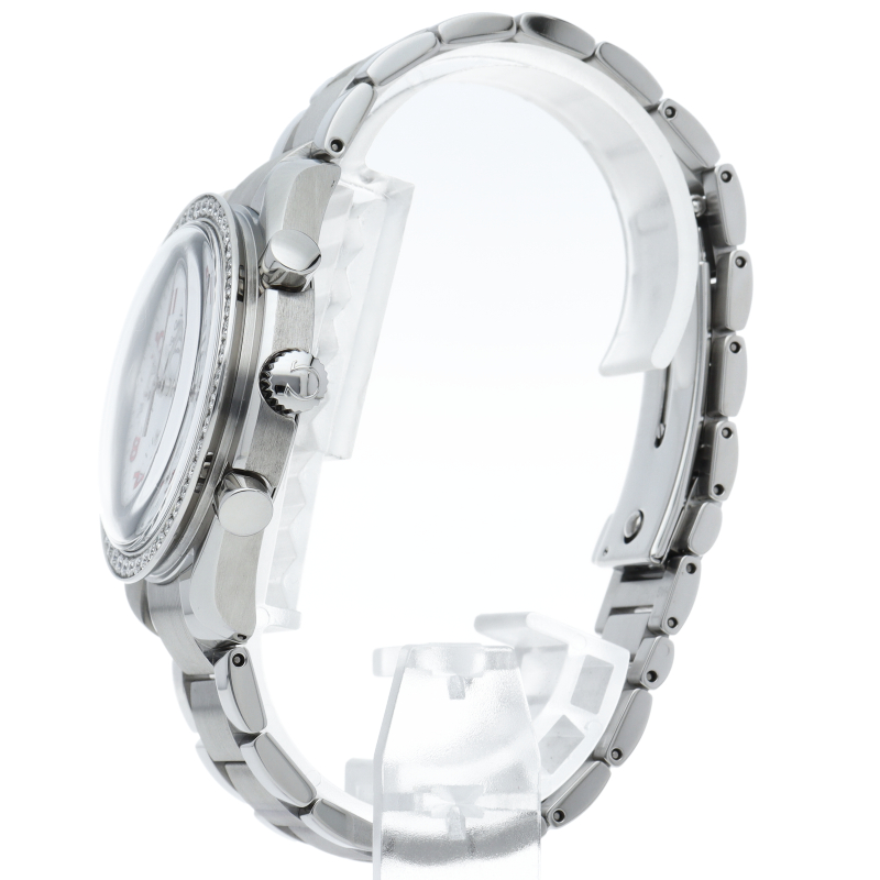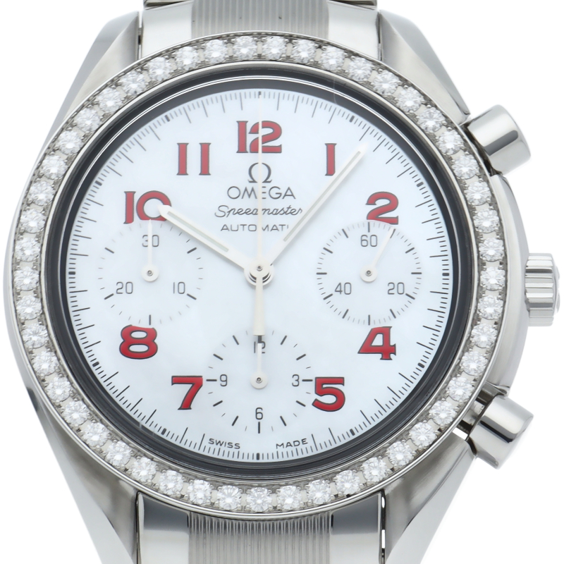 スポーティーで大きめなモデルにダイヤをプラスすることによって華やかさが一層際立つスピードマスター。インデックスのレッドカラーが印象的です。生産終了モデル。 基本的には女性におすすめの時計ですが、男女兼用でお使いいただけるサイズ感も魅力です。