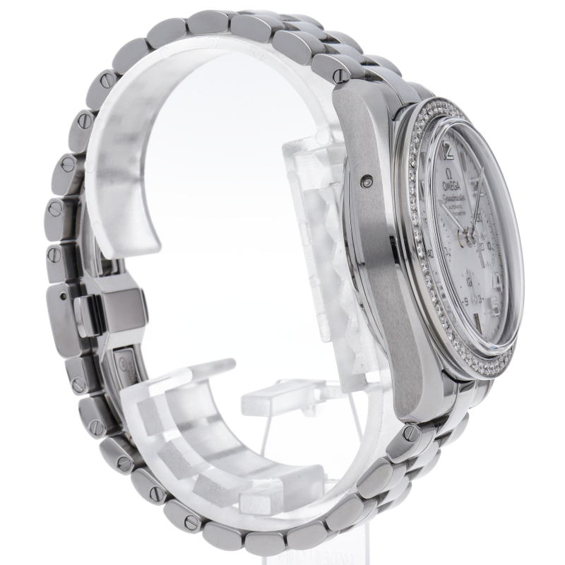 ホワイトマザーオブパールのダイアルに、6時位置の日付窓、傷の付きにくいサファイア・クリスタル ガラスが特徴です。ダイアルには、スモールセコンドダイアル、30分積算計、12時間積算計が配され、中央にクロノグラフ針が付属しています。ホワイトシェルダイヤルならではの艶やかな色味とダイヤモンドをセッティングしたベゼルが、お手元を華やかに演出します。