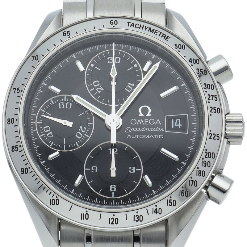オメガの代表的な人気シリーズ「スピードマスターデイト」。クロノグラフ・デイト表示機能付きと便利で実用性のある1本です。